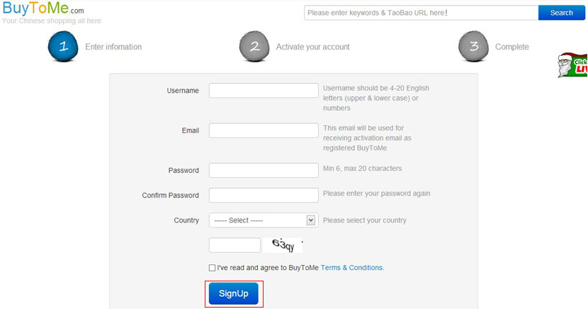 1. Click "sign up" in the top-left corner of any BuyToMe.com page;