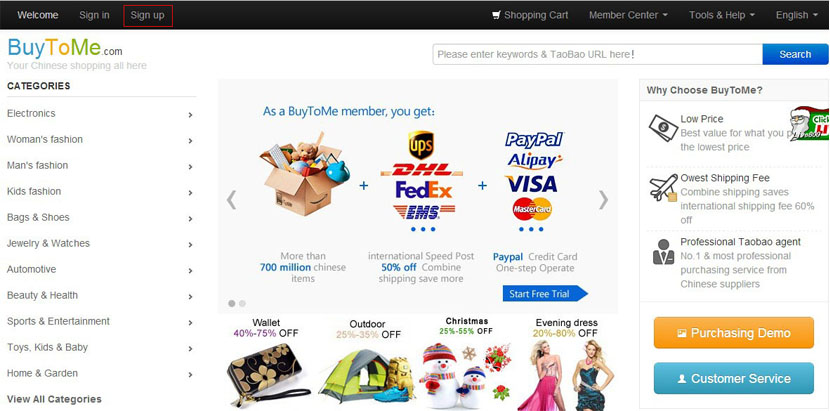 www8.buytome.com is taobao English online version with 50% OFF shipping fee. We are your private taobao english agent and help you to buy from China online.2 million vendors,800 million products, shipping to 170 countries, help you buy from Taobao and other chinese stores at Wholesale/Bulk price.ship with aramex, dhl and ems. Aramex | DHL | Paypal